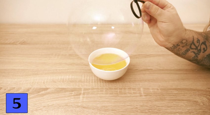 Наливаем в подходящую посуду воду, добавляем некоторое количество моющего средства, и тщательно перемешиваем. Из кабельной стяжки делаем кольцо подходящего размера, окунаем его в полученный раствор и выдуваем большие мыльные пузыри. Какого ребенка не заинтригует такое чудо?!
