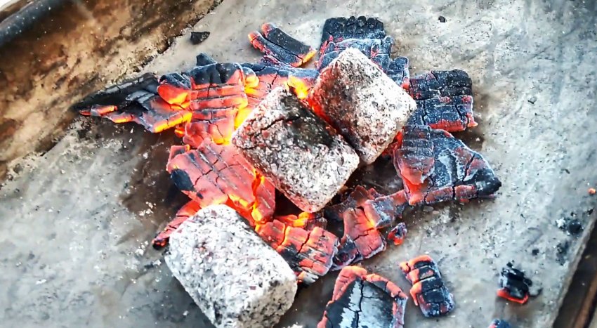 Протестируем брикеты в деле. Укладываем их вперемешку с растопкой снова в мангал и поджигаем. Через 15 минут растопка сгорает и начинают гореть брикеты, и это будет продолжаться 2 часа, после чего остается лишь маленькая горстка золы.