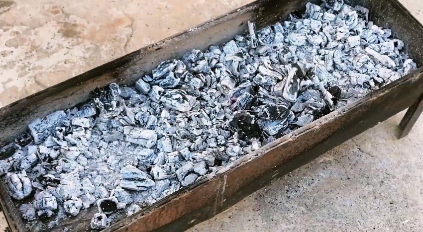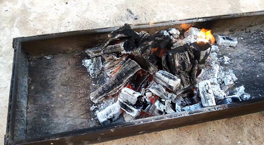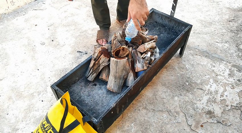 Укладываем поленца вперемешку с бумагой в мангал, сверху поливаем горючей жидкостью и поджигаем. Дожидаемся того момента, когда все дрова прогорят и распределяем древесный уголь по всему мангалу.