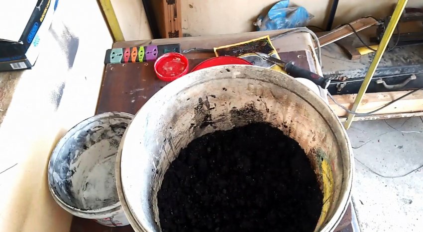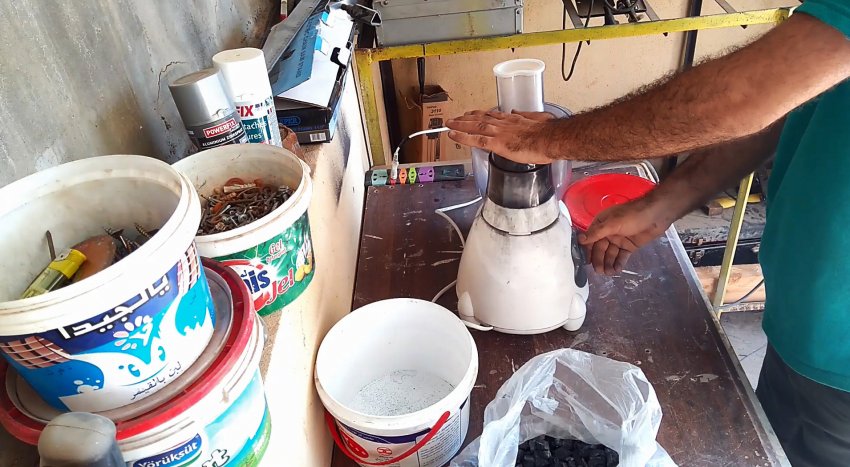 Загружаем порционно древесный уголь в блендер и превращаем его в порошок. Добавляем к нему 0,5 кг пищевого крахмала и оба компонента тщательно перемешиваем в емкости. Затем постепенно вливаем в полученную гомогенную смесь 1 литр воды и также хорошо перемешиваем.