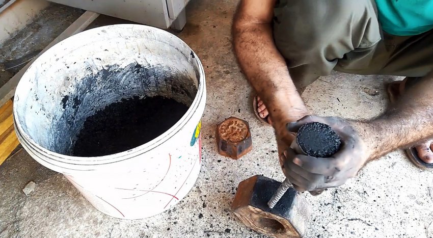 Набиваем в цилиндр влажную смесь угольного древесного порошка и пищевого крахмала. Далее ставим заполненный смесью цилиндр на твердую и массивную опору. Сверху на смесь устанавливаем круг и ударяем молотком или массивным грузом по торцу арматуры, добиваясь ее уплотнения.