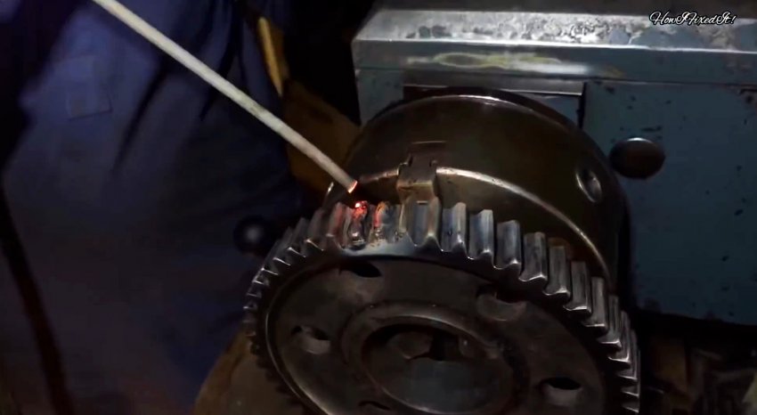 Закрепляем восстанавливаемую шестерню в патроне токарного станка, сводим биение боковых поверхностей шестерни до минимального значения с помощью биениемера и молотка, и начинаем с помощью сварочных электродов наплавлять слой за слоем металл на основание сломанных зубьев, регулярно и полностью отбивая образующийся при наплавке металла шлак.