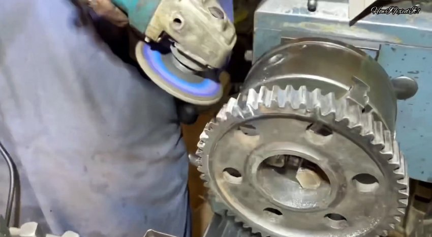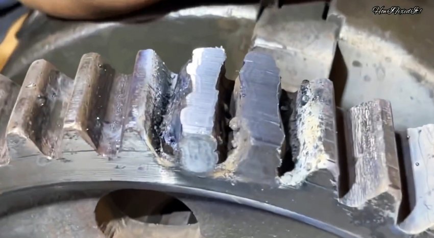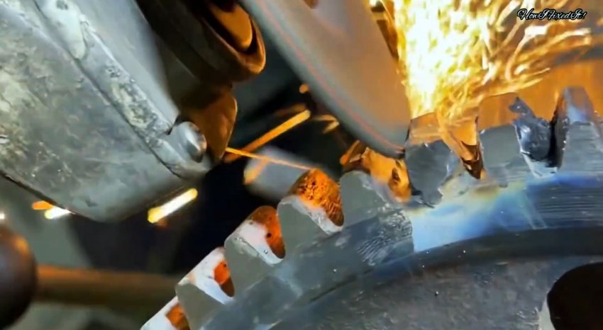 С помощью болгарки постепенно придаем наплавленным зубьям толщину и форму, ориентируясь на конфигурацию целых зубьев, вначале – с одной стороны шестерни, затем – с другой.