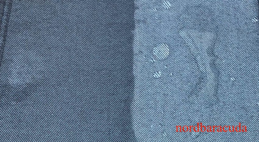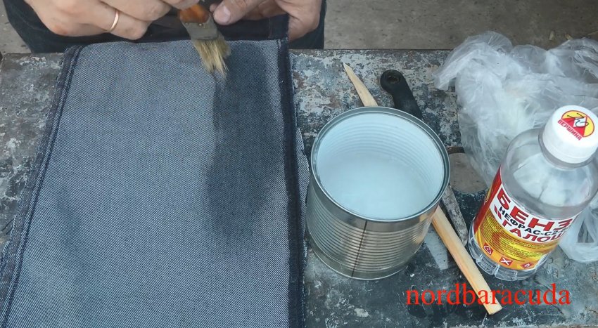 Приготовленный таким образом микст наносим обыкновенной кистью для краски или щеткой и просушиваем на солнце под открытым небом. Если пропитываемая ткань темного оттенка, то ее можно дополнительно прогреть строительным феном, чтобы не осталось никаких белесых разводов.