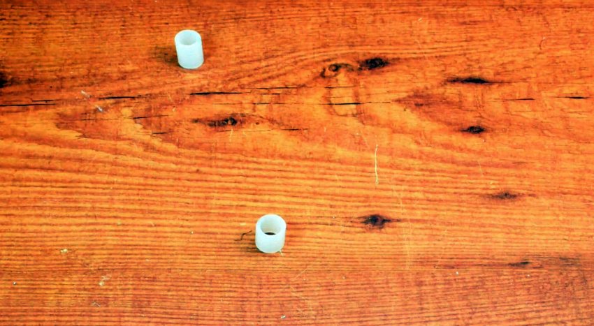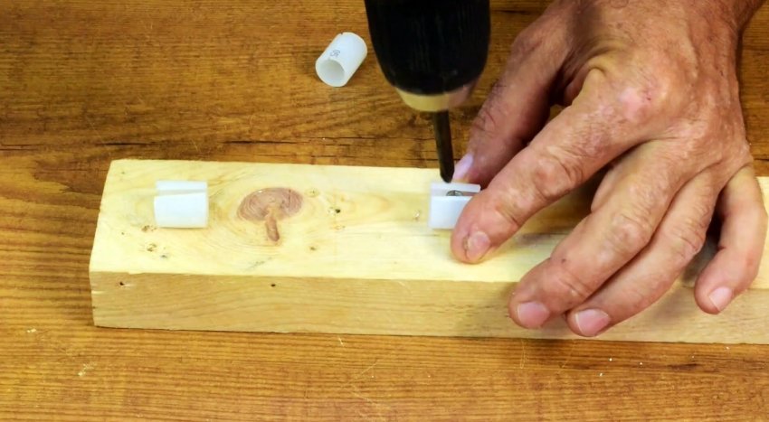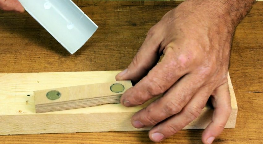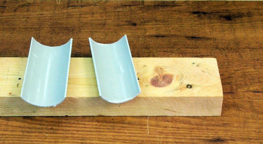 Разрезать пластиковую трубу, удерживая ее руками, неудобно и опасно. Зажим трубы в тисках без накладок может привести к повреждению. Разрежем продольно отрезок трубы пополам и прикрутим части шурупами к полоскам многослойной фанеры. Разместив между трубой и губками тисков накладки, обеспечим целостность трубы и легкий разрез.