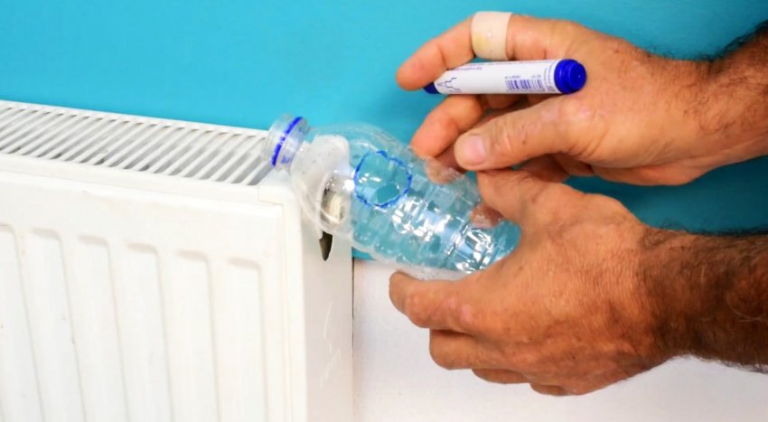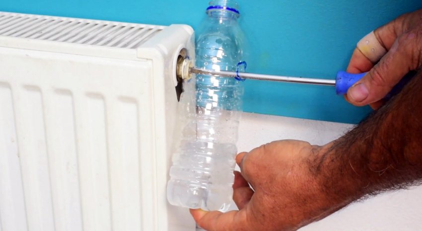Вырезаем под горловиной пластиковой бутылки большое и малое отверстие напротив друг друга. Прижимаем большое отверстие к заглушке, а через малое отверткой выкручиваем винтовую пробку. Вода из батареи при этом попадает в бутылку и пол остается сухим.