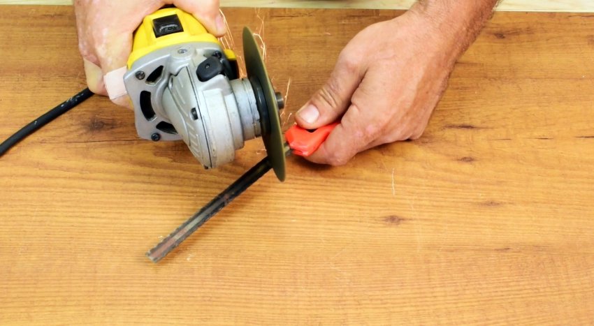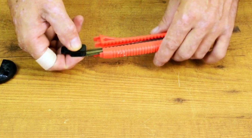 Снимаем крышку и движком удаляем остаток непригодного лезвия. На его место устанавливаем полотно ножовки по металлу. Возвращаем на место движок и крышку. Отрезаем часть полотна и затачиваем скос. Нож снова готов к работе.