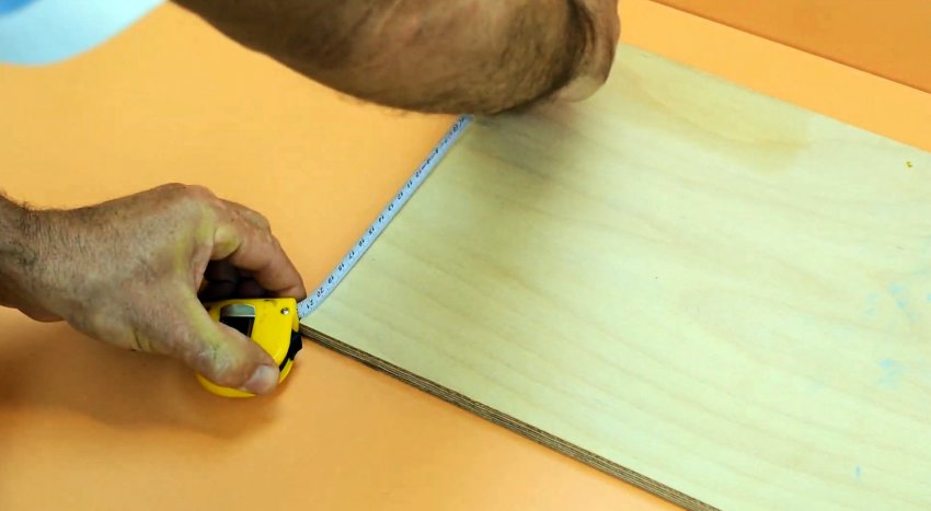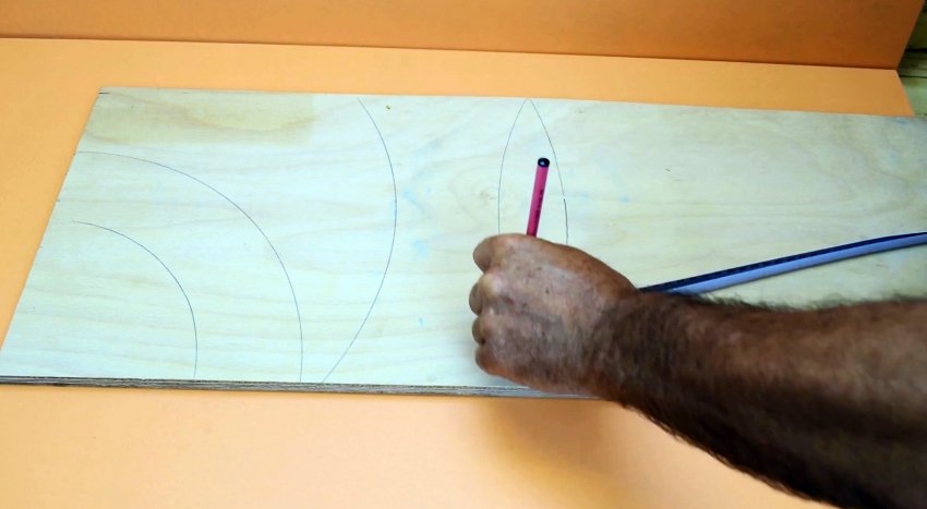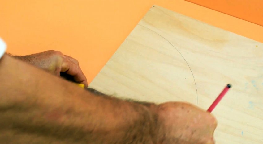 Выдвигаем мерную ленту на величину радиуса дуги, удерживаем отметку на ленте в центре окружности и карандашом на конце ленты проводим искомую дугу. Чтобы нарисовать «лепесток», ленту выдвигаем на несколько большее расстояние от края заготовки до ее центра. Удерживая отметку на ленте в центре стороны, карандашом на конце ленты проводим дугу. Перемещаем ленту на другую сторону заготовки, не изменяя длины, и также проводим дугу. Получаем контур «лепестка». Для удобства ленту выдвигаем в 2 раза больше и сгибаем пополам. Так удобнее проводить дуги. Если за радиус взять расстояние от края заготовки до ее центра и провести две дуги, взяв за центр окружности середины противоположных сторон, то они соприкоснутся точно в середине прямоугольника.