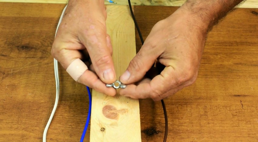 Для этого подойдут гайки-барашки. Переворачиваем их обратной стороной и закрепляем шурупами, разместив провода под ее лепестками, служащими опорами для закручивания или выкручивания.