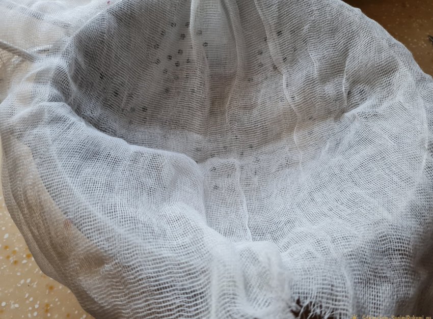 Переложила в дуршлаг, застеленный в несколько слоев марлей, установленный на посуде, в которую стекали излишки жидкости. Кстати., пусть это и не такой концентрированный, как традиционный, но все же сок.