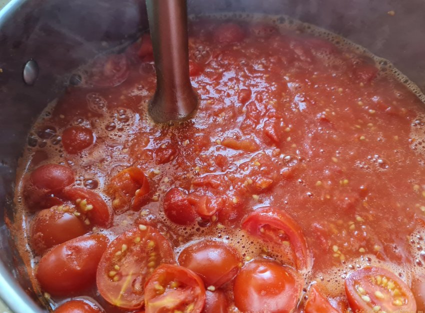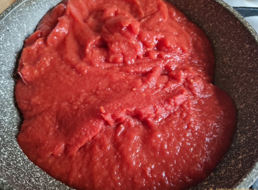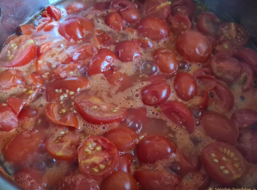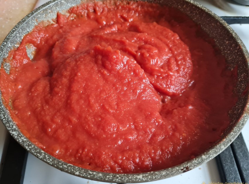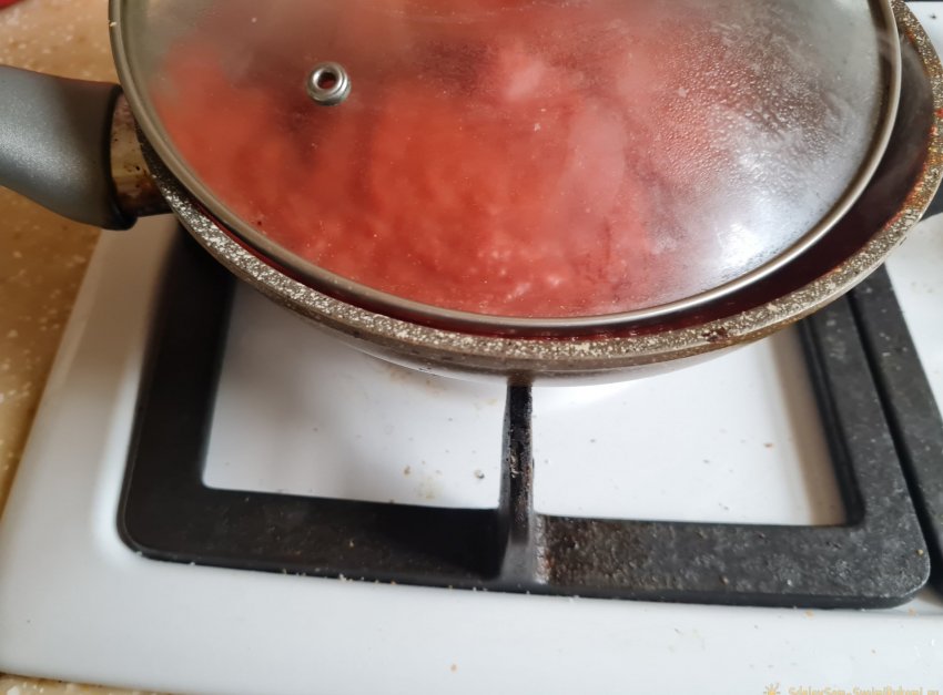 Разогрела сковороду прежде, чем начать доводить до полной готовности помидорный состав. Потом, когда он нагревался, необходимо было его перемешивать.