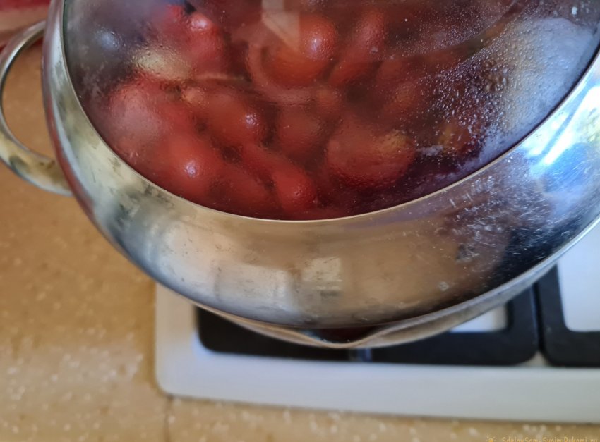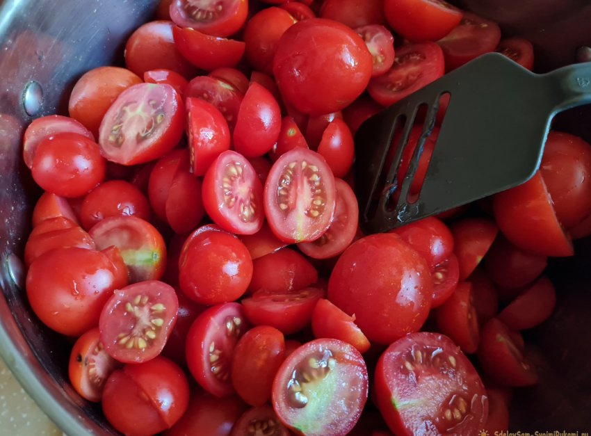 Перемешивала томатные фрагменты до той поры, пока не выделилось достаточно жидкости, чтобы можно было накрыть крышкой посуду, не заглядывая в нее в течение на получаса.