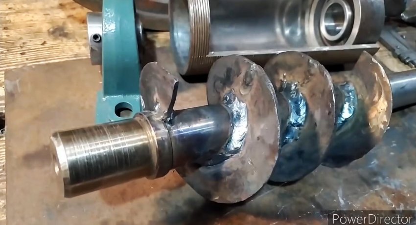 Затем эти разрезанные и разведенные шайбы привариваем к валу и между собой, в результате получаем шнек из трех полных витков с наружным диаметром немного больше 100 мм и шагом 60 мм.