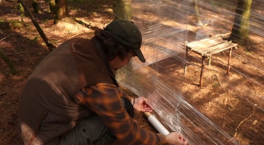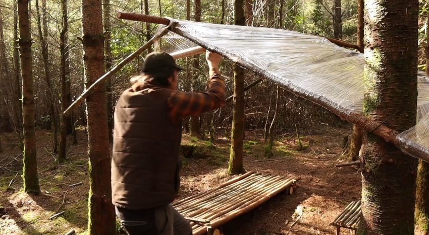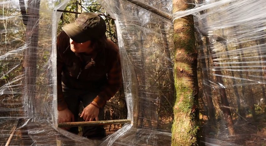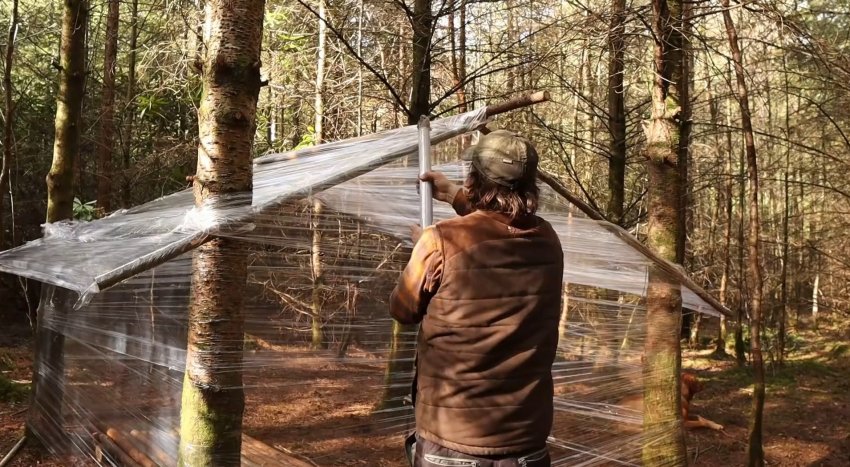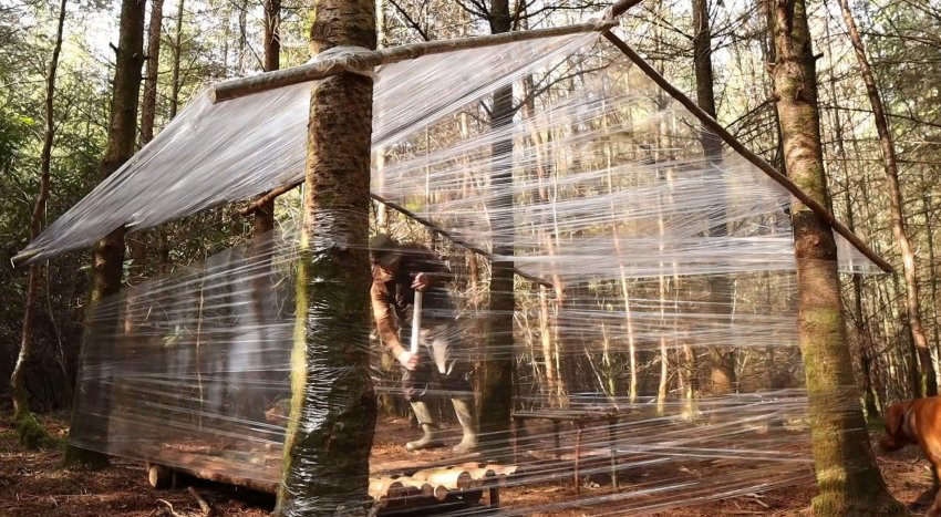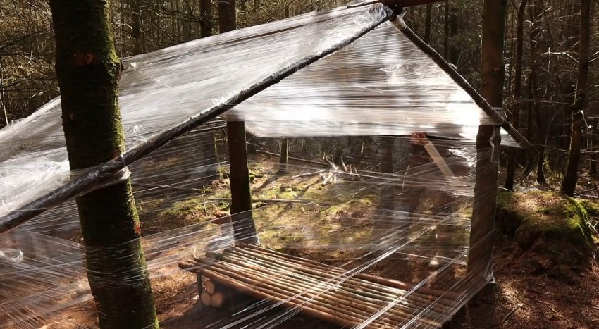 Если непогода летом или лютый мороз зимой застали вас в незнакомом лесу и неизвестно на каком расстоянии находится ближайшее жилище человека, то не стоит отчаиваться, особенно при наличии в вашем багаже рулона полиэтиленовой пленки, которой обычно обвязывают составные грузы на поддонах.