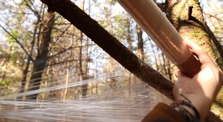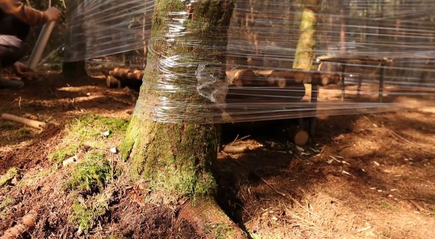 Затем приступаем к формированию стен. Для этого пленкой обхватываем стволы деревьев, начиная снизу, и постепенно поднимаемся до крыши. Чтобы стены были попрочней и лучше держали тепло, поверх продольного слоя пленки накладываем поперечный, каждый раз обрезая полотно у земли и подворачивая с другой стороны.