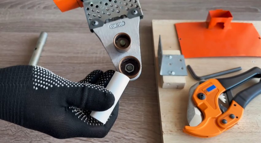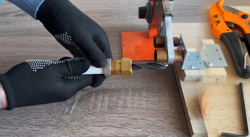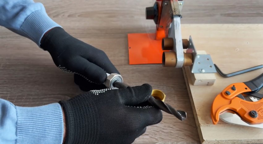 Для второй части будет использована труба 20 мм. Её подготовка проводится с помощью специального сварочного паяльника для пластиковых труб. Но насадка будет применяться не на 20 мм, а бОльшего размера. Потому, что нагревать наружный участок трубы нет необходимости. Требуется только сформировать бортик на конце трубы. Для её центровке в насадке паяльника используется гайка на 13 мм. После нагрева может быть деформировано и «заплавлено» внутреннее отверстие трубы. Чтобы этого избежать, используем сверло подходящего диаметра.