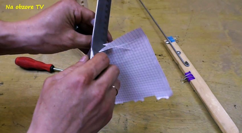 Заточку осуществляем путем перемещения заточной планки с наждачной бумагой в поперечно-продольном направлениях. После заточки одной стороны лезвия, нож переставляем и затачиваем вторую сторону лезвия. Если заточка произведена полностью и правильно, то нож с легкостью разрезает бумагу, не сминая ее.