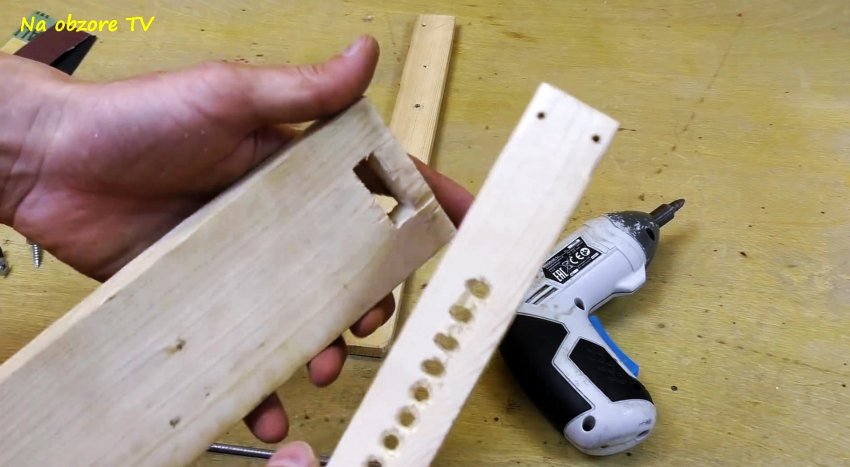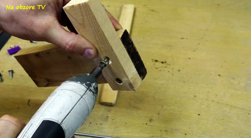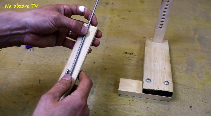 В прямоугольное отверстие основания вставляем планку с перфорациями по высоте круглой формы со сглаженными входами и выходами, и прикручиваем ее к основанию саморезами. Над упором не до конца вкручиваем в основание 2 самореза с круглыми широкими шляпками. Они будут нужны для фиксации ножа в процессе заточки.