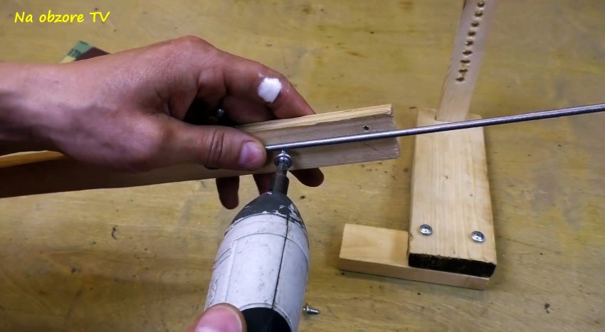 Обух ножа, лезвие которого требует заточки, подсовываем под шляпки шурупов, вкрученных в основание, и затягиваем. Прямой конец оголенного электрода вставляем в одно из отверстий в планке для обеспечения необходимого угла заточки данного ножа.