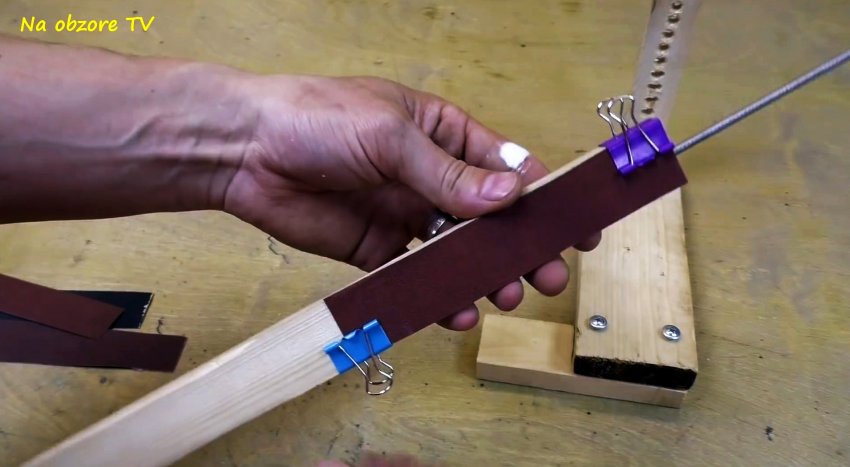 На противоположную сторону деревянного бруска укладываем полоску наждачной бумаги требуемой зернистости и закрепляем с двух сторон канцелярскими зажимами. При необходимости одну наждачку можно легко заменить на другую.