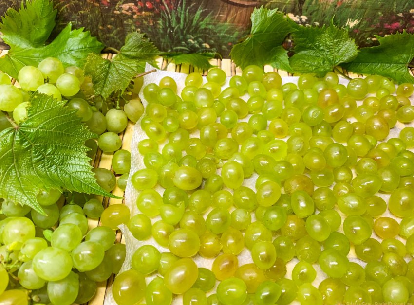 1. Обрываем с виноградной кисти только целые и спелые плоды. Подгнившие и деформированные ягоды удаляем.