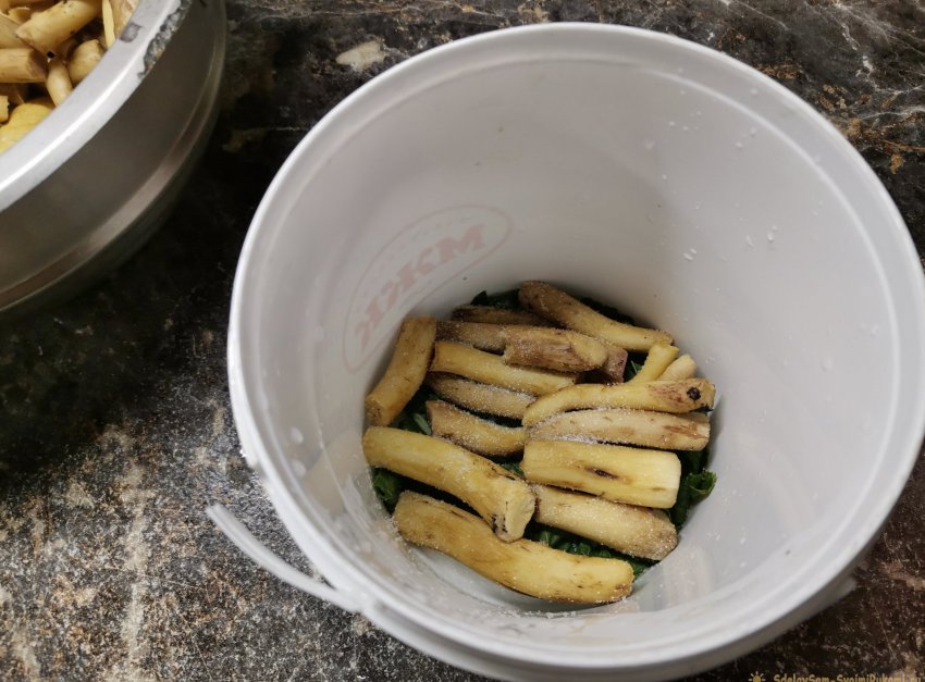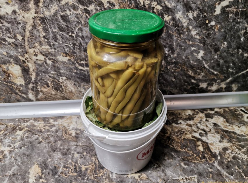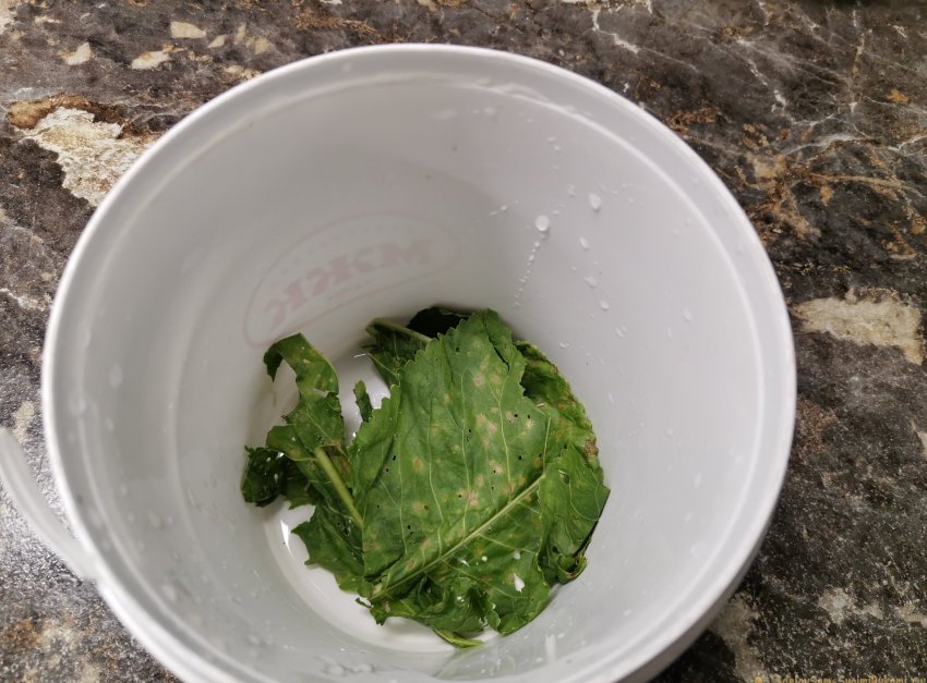 Я использую пластиковые литровые банки из-под майонеза или специальные покупные контейнеры. На дно емкости выкладываю листья.
