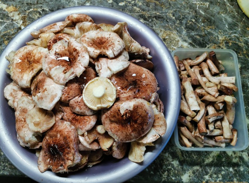 Отделяем шляпки от ножек. Многие этого не делают, но поверьте, подавать к столу лучше отдельно ножки, отдельно шляпки. Они и по вкусу разные, и блюдо будет выглядеть интереснее. Да и солить так намного проще.