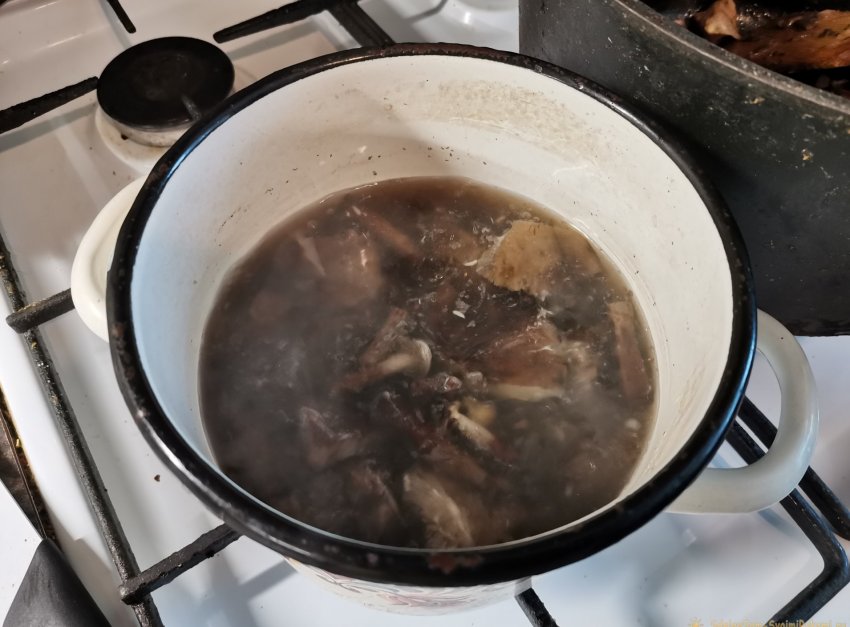 Кипятим воду и отвариваем грибы. Рядовки и волнушки я варю 8-10 минут, а вот грузди не больше 5 минут. Люблю грибы немного хрустящие.