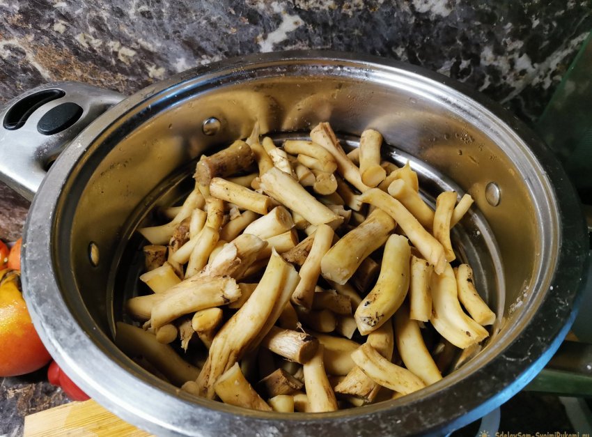 Рядовки очищаем от грязи. Заливаем водой и оставляем на час. Хорошо промываем.