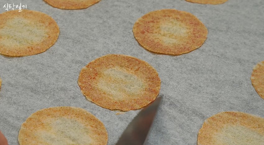 Достаем противень, снимаем верхний лист пергамента и с помощью ножа аккуратно отделяем чипсы от нижней основы.