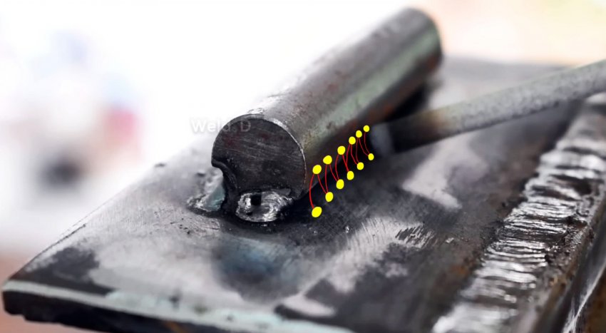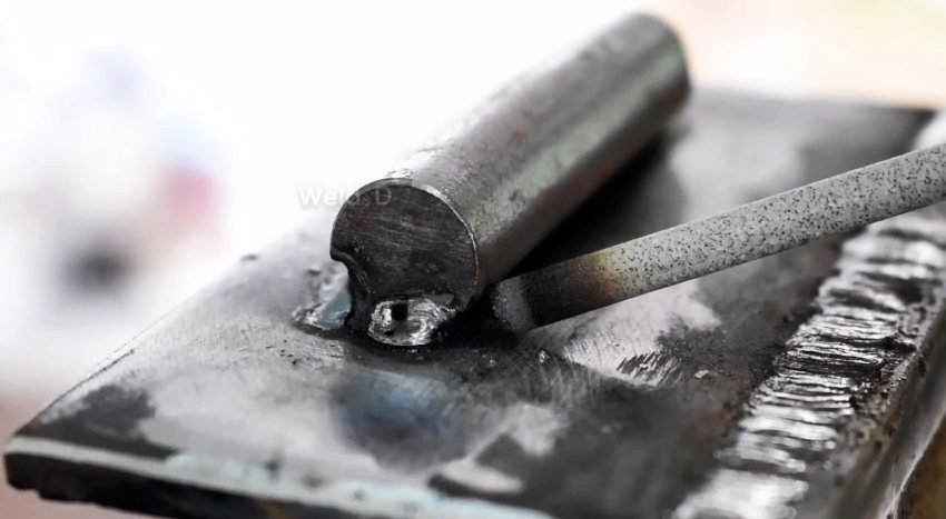 Чтобы продемонстрировать работу начинающего и опытного сварщика, возьмем в качестве соединяемых деталей металлический стержень и плоскую металлическую поверхность. Это похоже на приварку круглых дверных петель к косяку и полотну. Пользоваться будем ручной дуговой сваркой и покрытыми электродами марки Е6013 диаметром 2,6 мм.