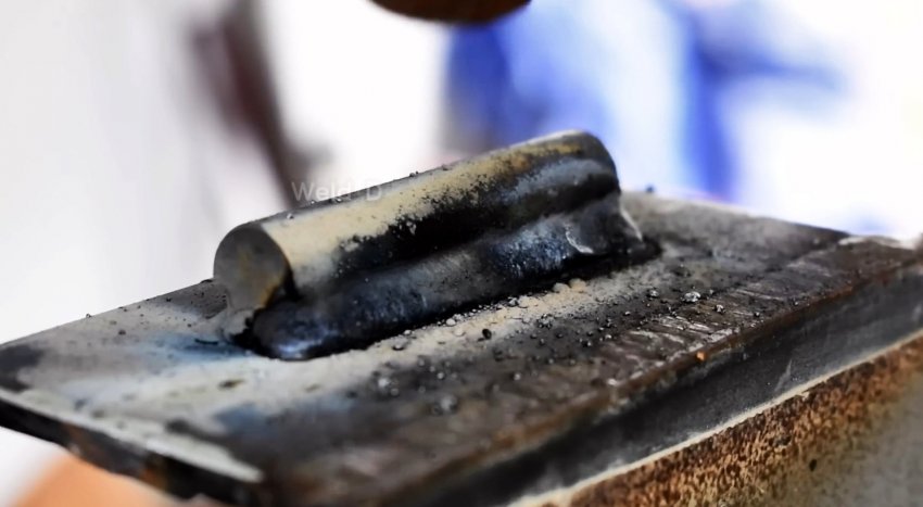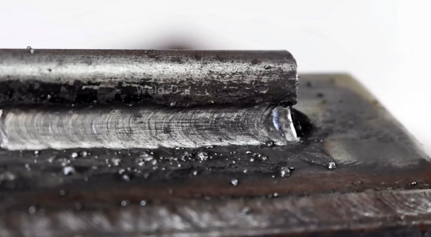 Он, учитывая толщину деталей, увеличивает сварочный ток до 95 А, уменьшает угол расположения электрода по отношению к плоской детали и планирует совершать концом электрода зигзагообразные поперечные движения между соединяемыми деталями. Затем мастерски воплощает задуманное в действительность. После отбития шлака, мы видим сплошной равномерный по высоте и ширине плотный сварочный шов без шлаковых включений.