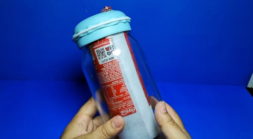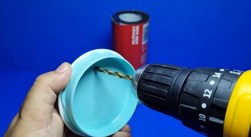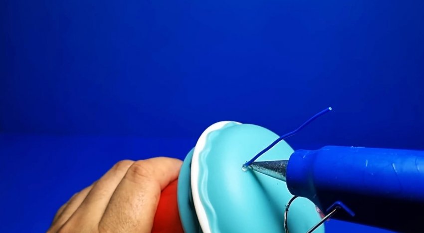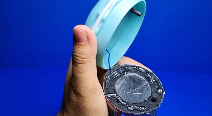 Также сверлим к крышке отверстие под провод от листа. На торец фильтра наносим горячий клей, и приклеиваем его к крышке емкости так, чтобы электрод попал в отверстие в фильтре.