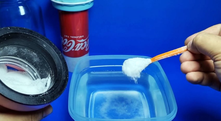 Получилось своеобразная водно-солевая батарея. Для ее заправки возьмем воду и насыпем в нее несколько ложек пищевой, поваренной соли. Помешаем до растворения.