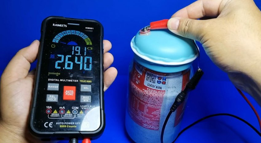 Теперь, если подключить мультиметр к электродам, то на дисплее отобразится значение порядка 2,6 В. Конечно, этого для свечения даже светодиода будет недостаточно, но силы тока должно хватить, чтобы запустить преобразователь.
