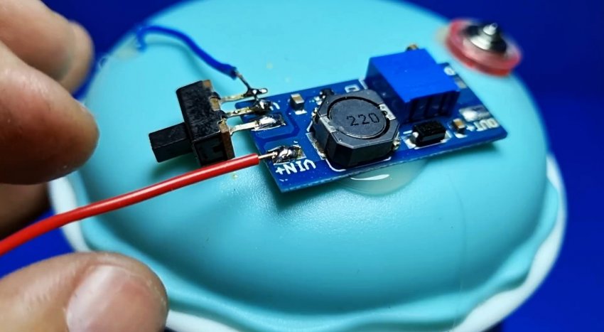 Также при помощи горячего клея приклеиваем преобразователь на верх батареи, припаиваем провода от электродов через переключатель.