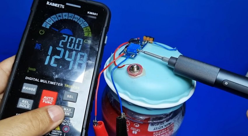 Подключаем мультиметр к выходу преобразователя. Подстроечным резистором настраиваем выходное напряжение на 11-12 В.