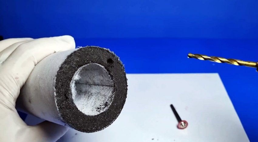 Угольный фильтр необходимо обрезать по длине емкости. Сделать это можно обычной ножовкой. Предварительно ножницами срезается капроновая сетка.
