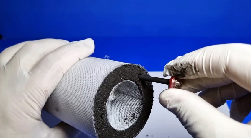 В торце обрезанного фильтра сверлим отверстие под электрод из батарейки.