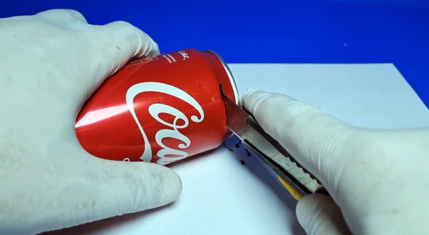 Далее необходимо отрезать вверх и дно алюминиевой банки. Затем получившийся цилиндр разрезать вдоль, чтобы получился лист.