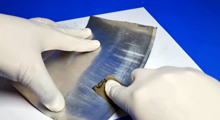При помощи наждачной бумаги необходимо убрать защитное, лаковое покрытие на внутренней, блестящей стороне.
