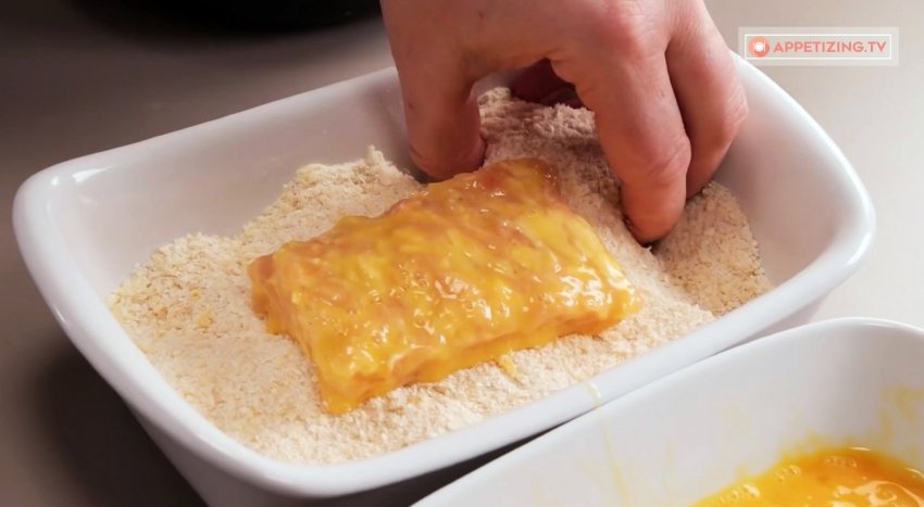 Каждую заготовку обмокните в яйце, взбитом вилкой. Затем в панировочных сухарях.