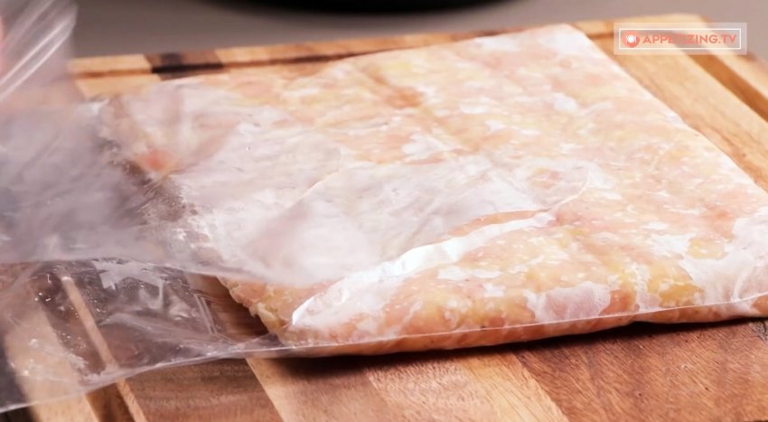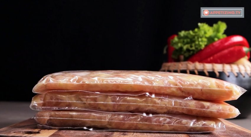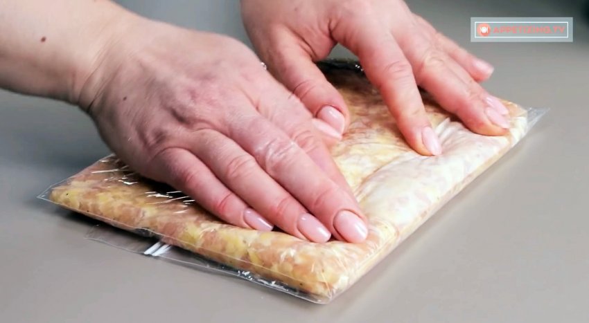 Фарш хорошо вымешайте руками, чтобы масса стала однородной. Разделите ее на несколько частей и поместите в полиэтиленовые пакеты. Сформируйте прямоугольную форму и уберите в морозильную камеру на 3 часа.