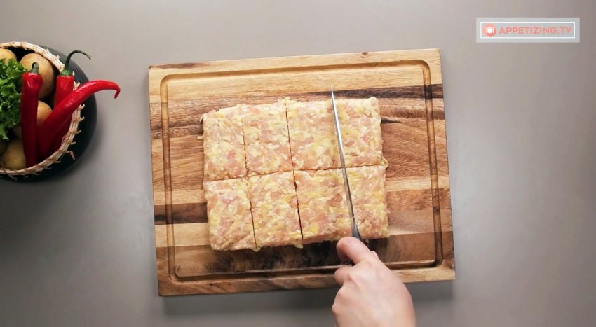 Когда полуфабрикат затвердеет, достаньте его и разрежьте на квадратные котлеты.