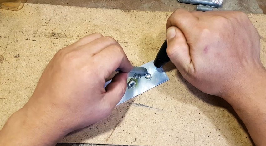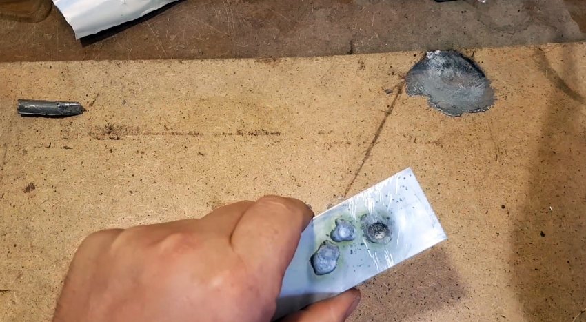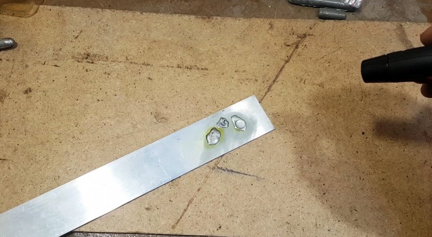 Начнем с процесса запаивания несколько отверстий разного диаметра в алюминиевой пластине размером 40?2 мм. До начала пайки тщательно удаляем оксидную пленку с поверхности заготовки, например, наждачной бумагой, хотя, если верить инструкции по применению, эта операция не обязательна.