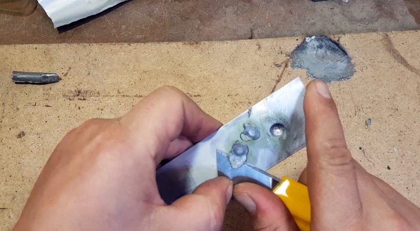 Попытаемся запаять паяльником фрагмент, вырезанный из алюминиевой банки, используя вышеуказанные стержни. Для этого в нем выполняем надрез кончиком ножа и расплавляем стержень.