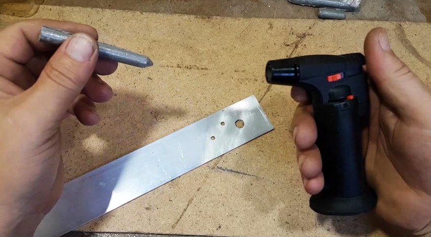 Повторяем эту же операцию и в отношении разреза, выполненного болгаркой в алюминиевой пластине. При этом нагрев последовательно ведем сперва паяльником, а затем завершаем газовой горелкой.
