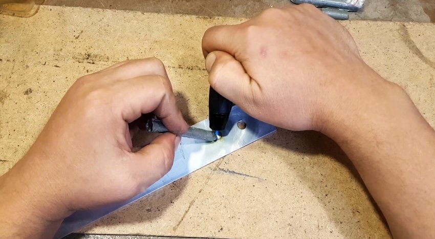 Вначале пламенем газовой горелки прогреваем материал пластины в области пайки. Для этого используем обыкновенную газовую горелку. Затем расплавляем кончик стержня, запаиваем отверстия в пластине и оставляем пайку на некоторое время для охлаждения и затвердевания.