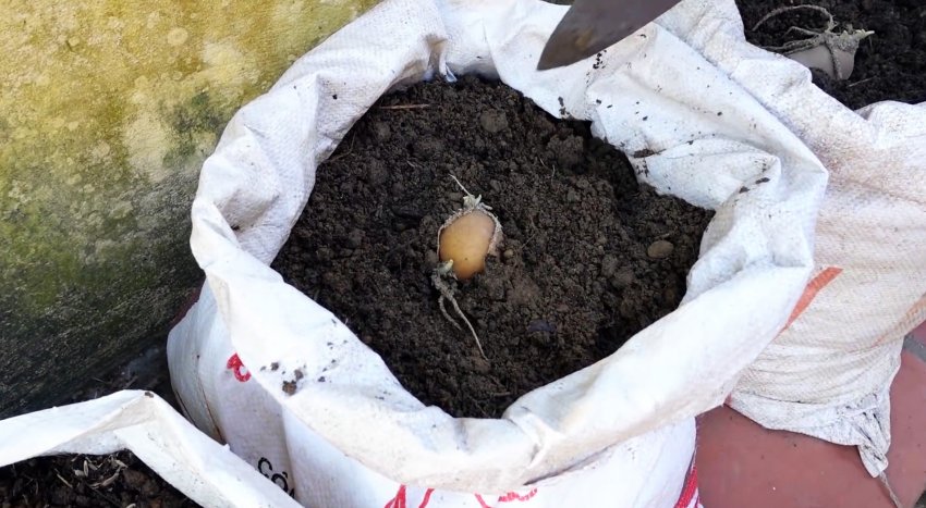 В центре каждого мешка сделайте углубление и положите один клубень картофеля. Сверху присыпьте землей.