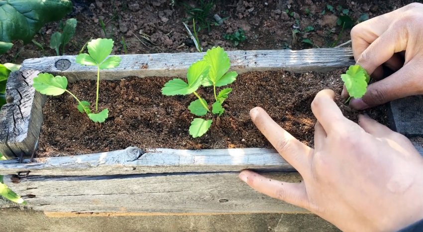 Растения такого размера можно пересаживать на уличные грядки. Для этого разделите выращенные ростки клубники на клубни и высадите их на участок. Пальцем сделайте углубление в земле и поместите в ямку росток. Расположите клубни на расстоянии примерно 10 см. друг от друга.